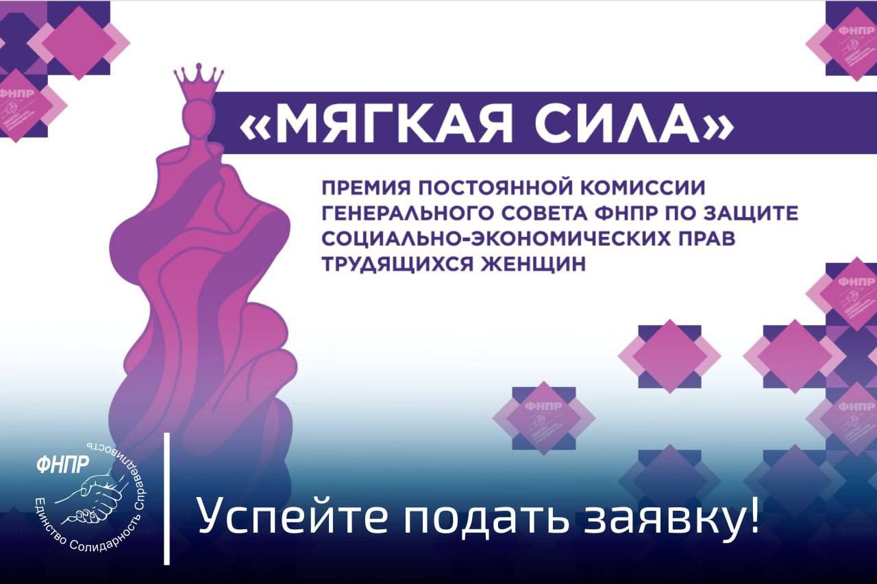 Девушки и женщины, входящие в Общероссийский профессиональный союз работников физической культуры, спорта и туризма РФ, приглашаются к участию в премии «Мягкая сила», учрежденной Постоянной комиссией Генсовета Федерации независимых профсоюзов России по защите социально-экономических прав женщин. Премия направлена на поддержку лучших практик работы женщин и женсоветов в профсоюзных организациях. Конкурс проводится в пяти номинациях: «Структура» — для профсоюзных организаций с системной работой по семейной тематике; «Женсовет» — для наиболее эффективных советов по защите интересов семей; «Лидер» — для женщин-руководителей и активисток, защищающих права трудящихся женщин; «Наставник» — для профсоюзных лидеров, работающих наставниками в коллективах;